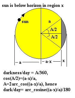 In Figure 2, a side view, the horizon line makes an angle L, the observer's latitude, with respect to the north celestial pole,ncp. The sun's celestial latitude is G. In Figure 3, assuming uniform daily motion on the declination circle, we determine the fraction of the day spent in darkness in terms of the angle A, which can be obtained graphically by measuring x and a in Fig.2. With the aid of Fig 2. we can also determine that (a-x)/a = tanL*tanG., derivation So the fraction of the day spent in darkness is