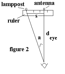4) Step to the other end of the meter stick with your toe exactly one meter away from its former position. This distance is the baseline S. Sight on the lamppost again. Note whether the lamppost has shifted to the left or right of your line of sight to the antenna. Holding the small ruler at arm's length read off the distance on the ruler between the center of the lamppost and the antenna as seen against the ruler. This is the distance s . See figure 2.