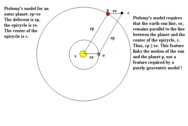 Exercise: 1) On a separate sheet of paper draw two circles around the sun and mark the position of the earth, e, and an outer planet p. 2) Draw the deferent of radius rp around the earth. 3) The planet is a distance re away from the center c of the epicycle. Draw a circle of radius re around p. 4) Where the epicycle circle intersects the deferent is the location of c. 5) Draw in the lines se, sp, rp, pc. You should see a parallelogram. |
