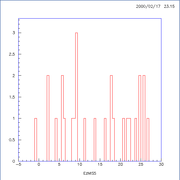 370 counts in the two body peak for 2.0 M events which corresponds to about 2 1/2 hours of running, or 148 counts per hour. This is about 2 times the MCEEP estimates done by Paul Ulmer recently. A sample  spectrum is shown below. With all the q, omega and pmiss cuts we get about 6 counts total or 2.4 counts per hour compared to the MCEEP estimate of 1.6 counts per hour. Note that Paul Ulmer used a lower luminosity than we are presently running with. He assumed 95 uA of beam and target density of about 0.5 g/cm^2 which is about 1/2 our present luminosity.